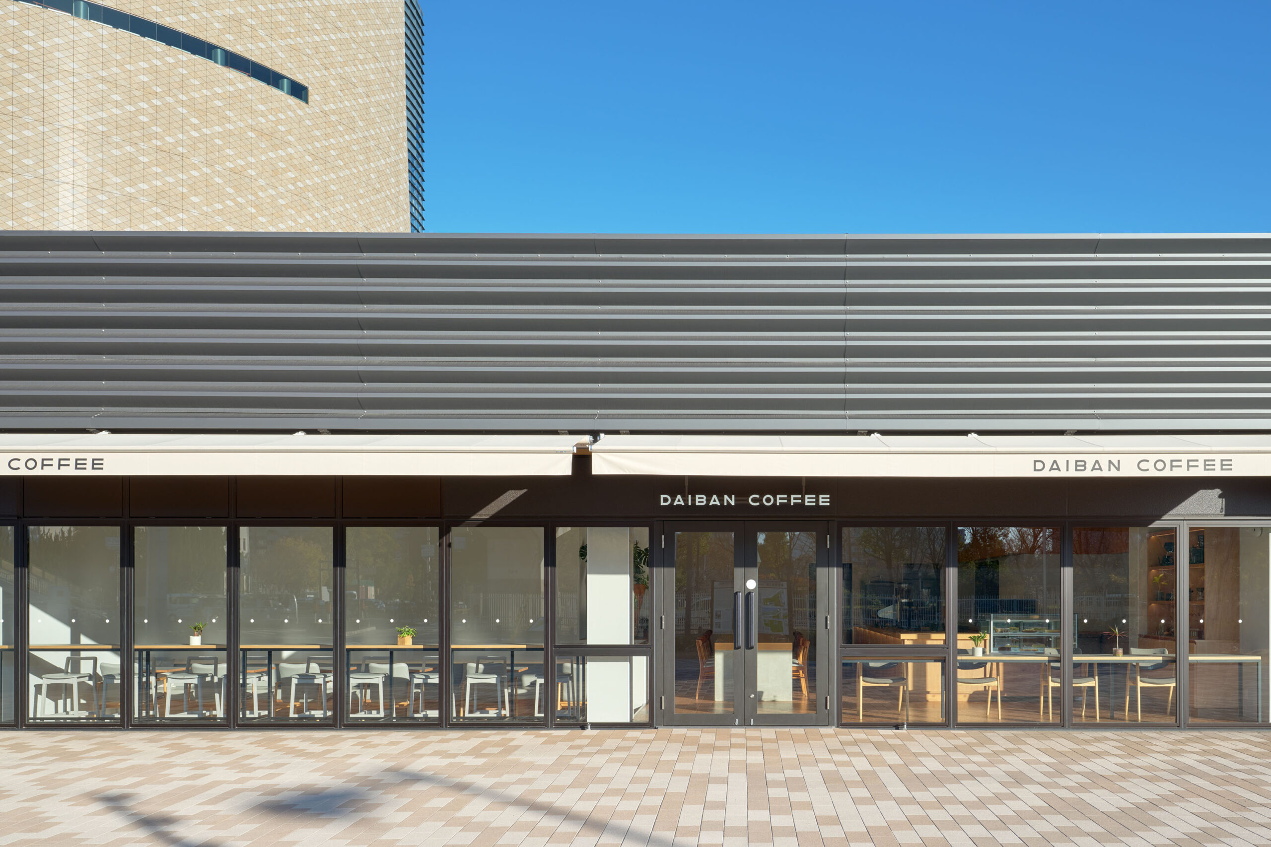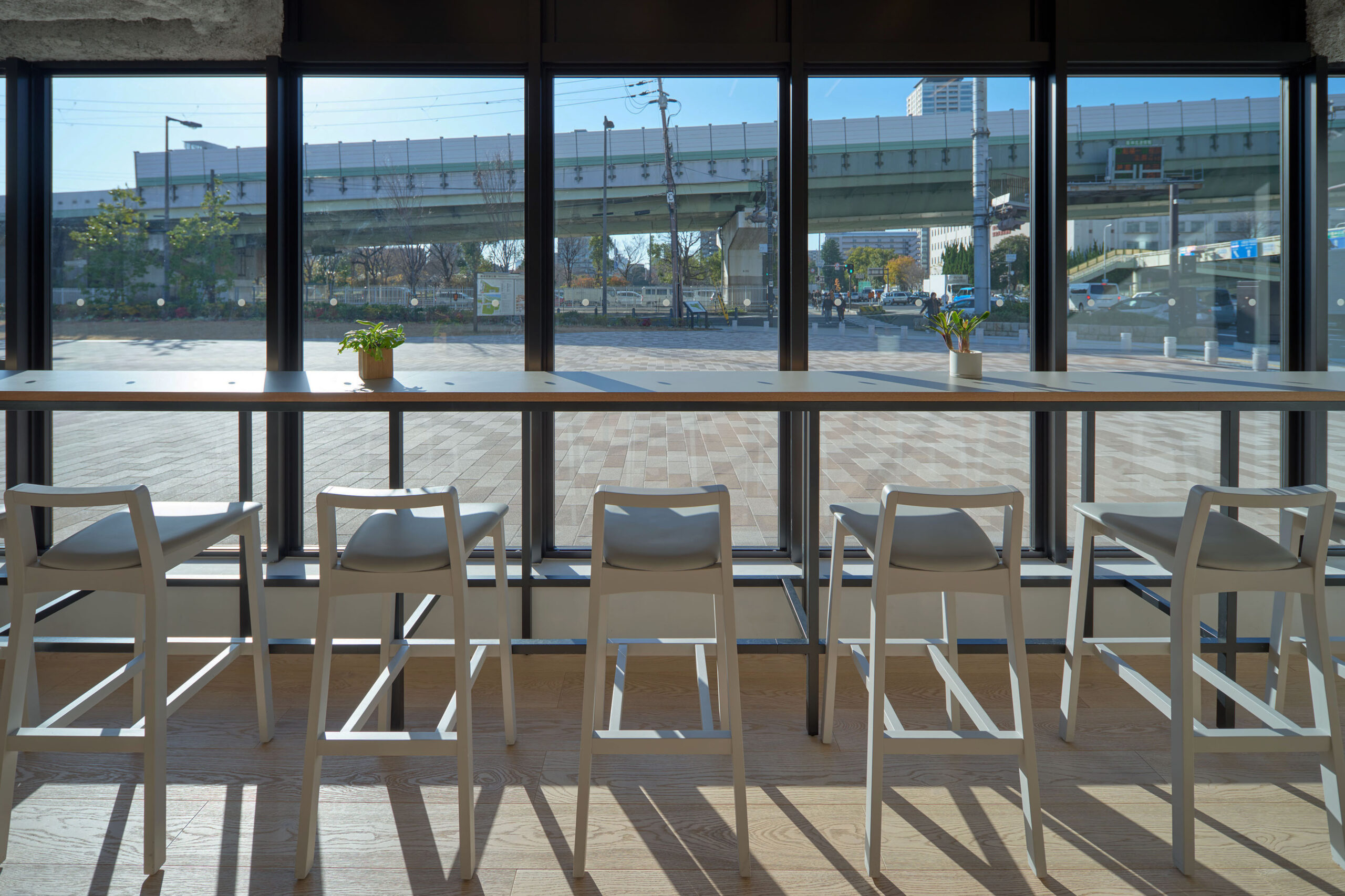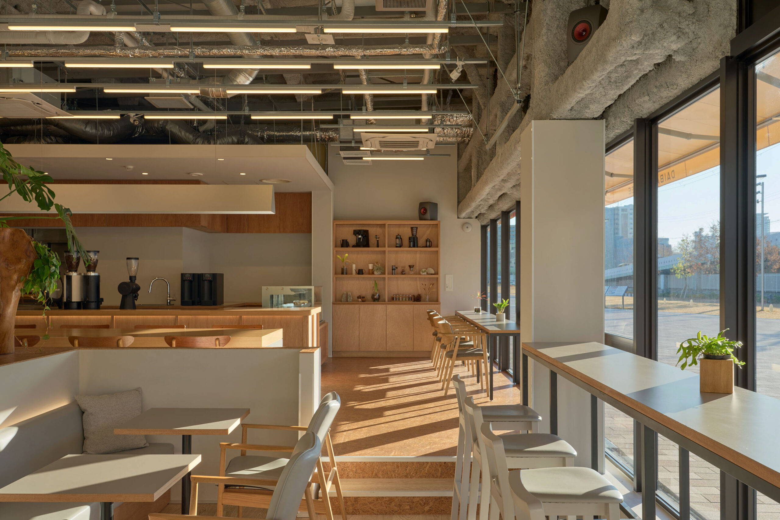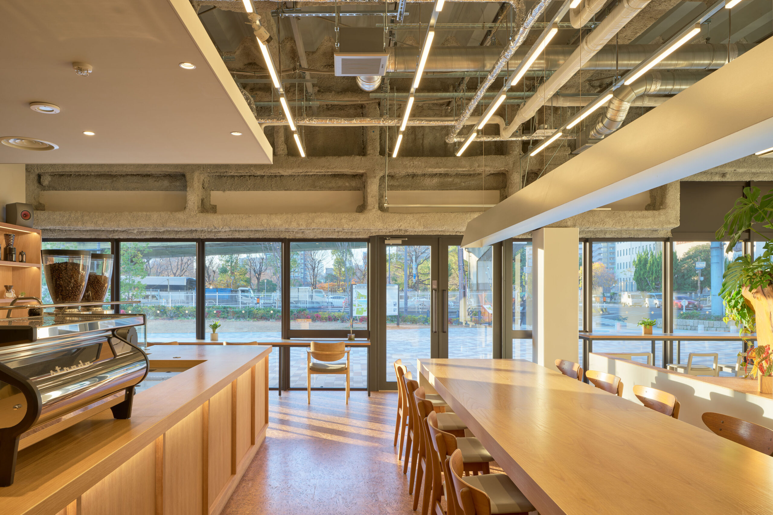 難波宮跡公園「なノにわ」の一角にあるカフェを設計した。大阪市初となるPark-PFIによる商業施設「なノにわ」。店舗は大阪城から連続する大きな公園に面しており、目の前にははおおらかな芝生の広場が広がっている。観光客も多く、一日を通して常に公園を訪れた人が行き来するような場所である。 そこで、できるだけ公園のもつ明るく開放的な環境に溶け込むように、その空気感を店舗の中にまで連続したいと考えた。外壁の窓際はカウンター席にしつつ、全般照明やペンダント照明、テーブルを奥行方向に連続させることで、店内も公園の一部であるような自然な繋がりをつくっている。 お散歩のついでに気軽に立ち寄ることのできる、広場そのもののようなカフェ。においてこだわり抜いた自家焙煎のスペシャルティコーヒーと名物のアサイーボウルを楽しんで欲しい。