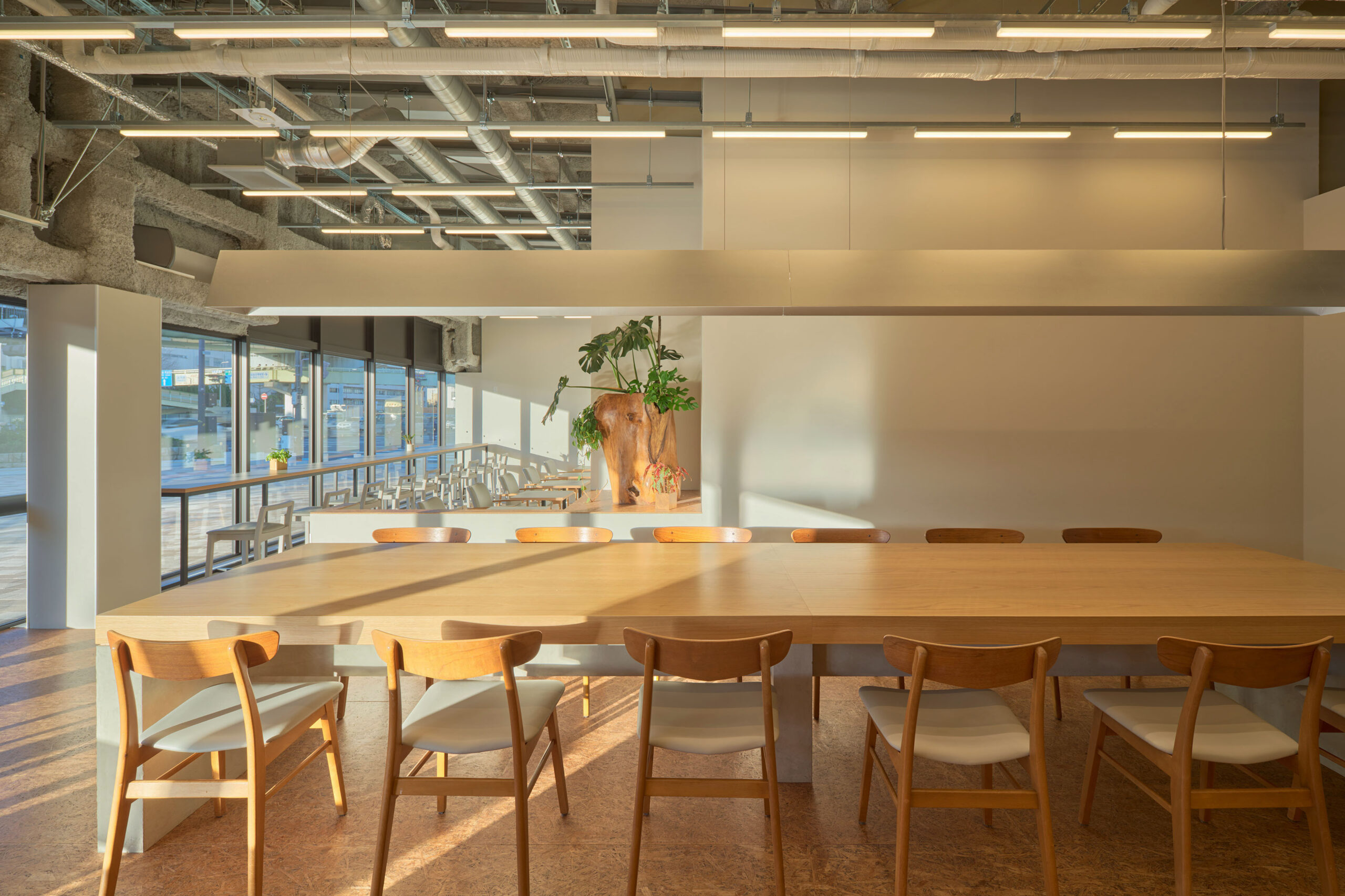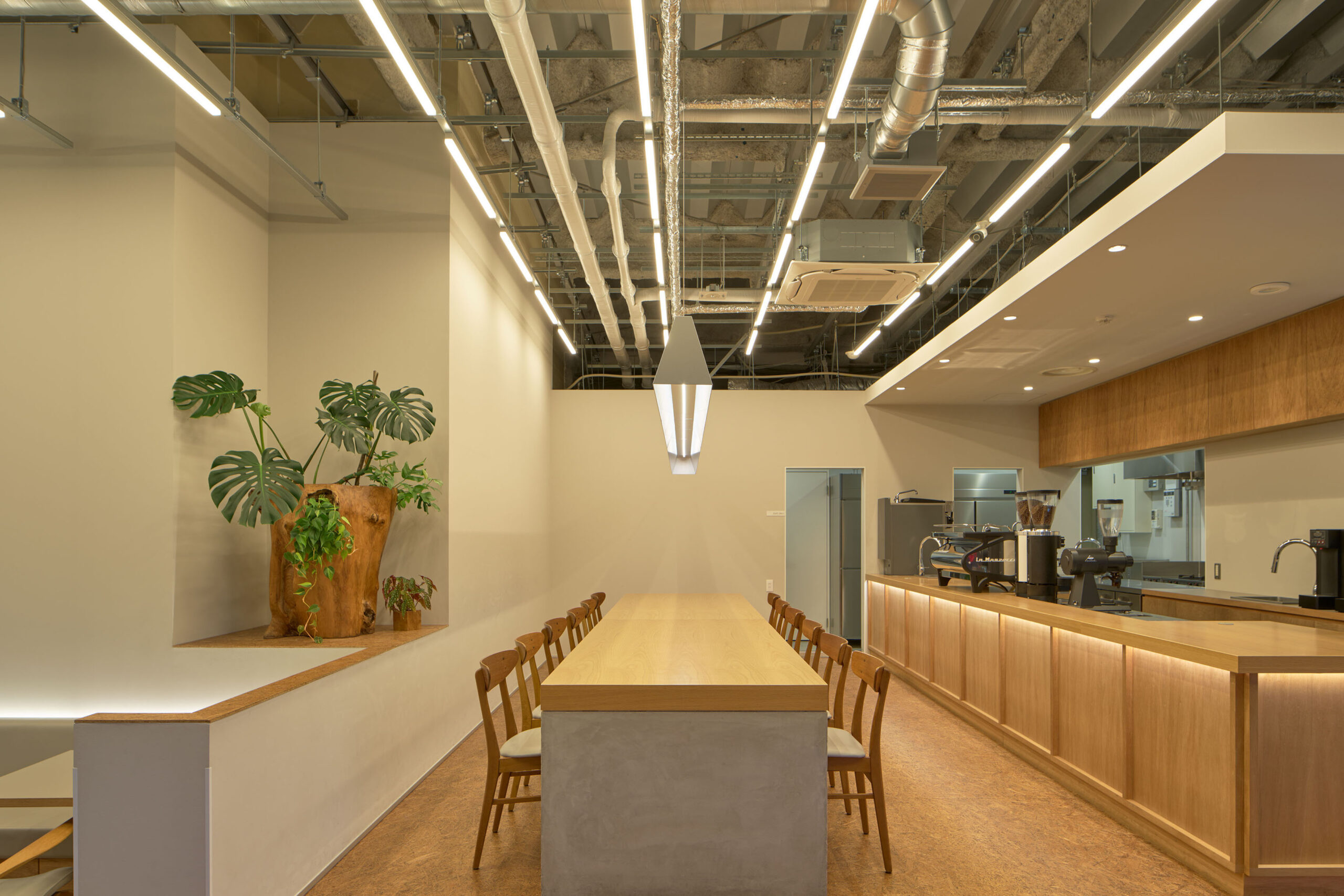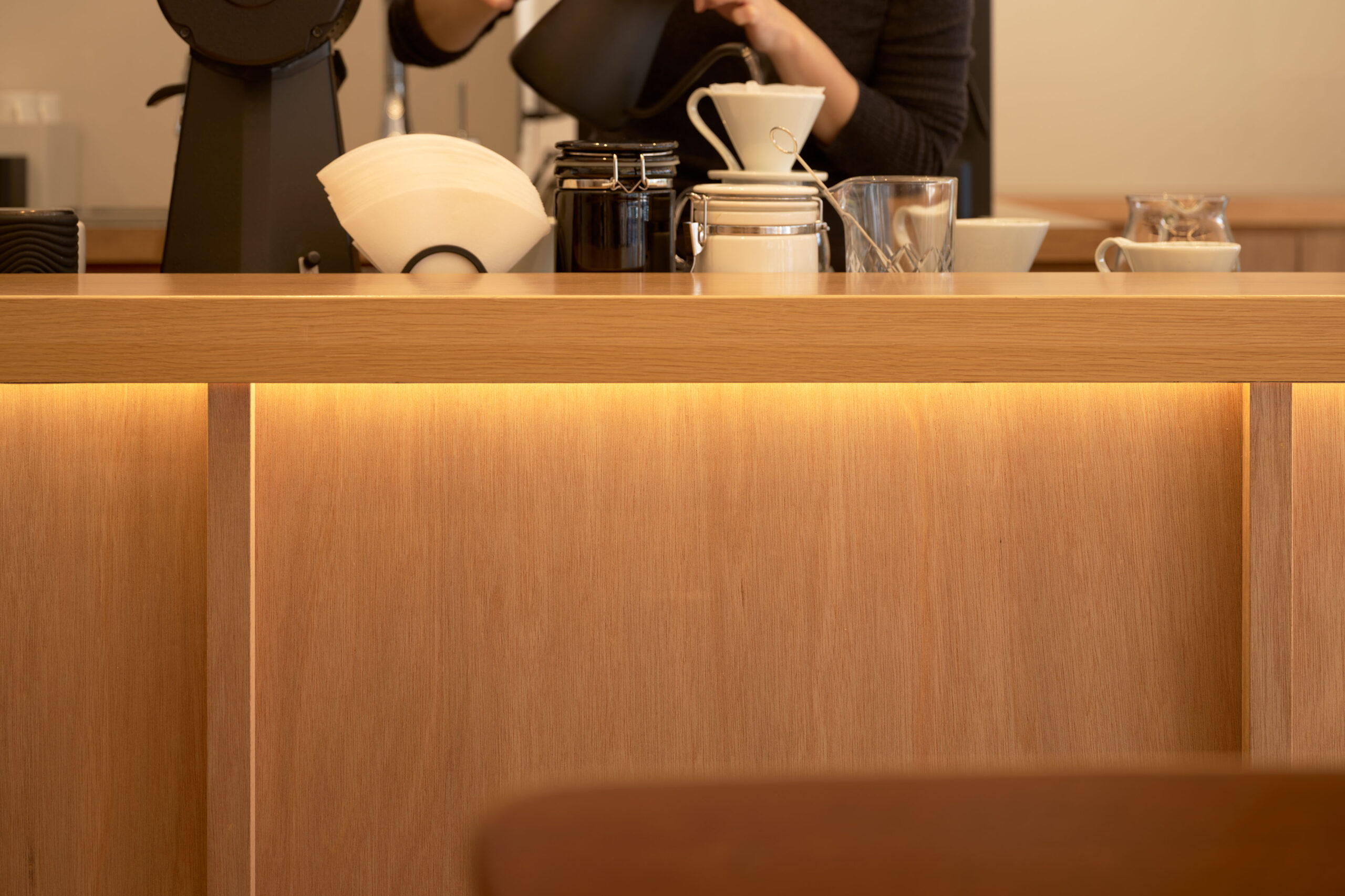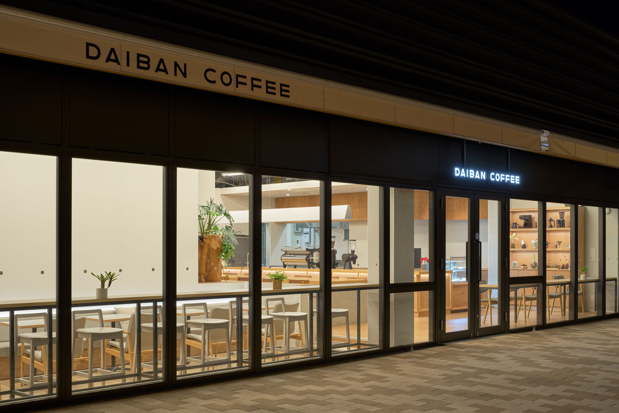 難波宮跡公園「なノにわ」の一角にあるカフェを設計した。大阪市初となるPark-PFIによる商業施設「なノにわ」。店舗は大阪城から連続する大きな公園に面しており、目の前にははおおらかな芝生の広場が広がっている。観光客も多く、一日を通して常に公園を訪れた人が行き来するような場所である。 そこで、できるだけ公園のもつ明るく開放的な環境に溶け込むように、その空気感を店舗の中にまで連続したいと考えた。外壁の窓際はカウンター席にしつつ、全般照明やペンダント照明、テーブルを奥行方向に連続させることで、店内も公園の一部であるような自然な繋がりをつくっている。 お散歩のついでに気軽に立ち寄ることのできる、広場そのもののようなカフェ。においてこだわり抜いた自家焙煎のスペシャルティコーヒーと名物のアサイーボウルを楽しんで欲しい。