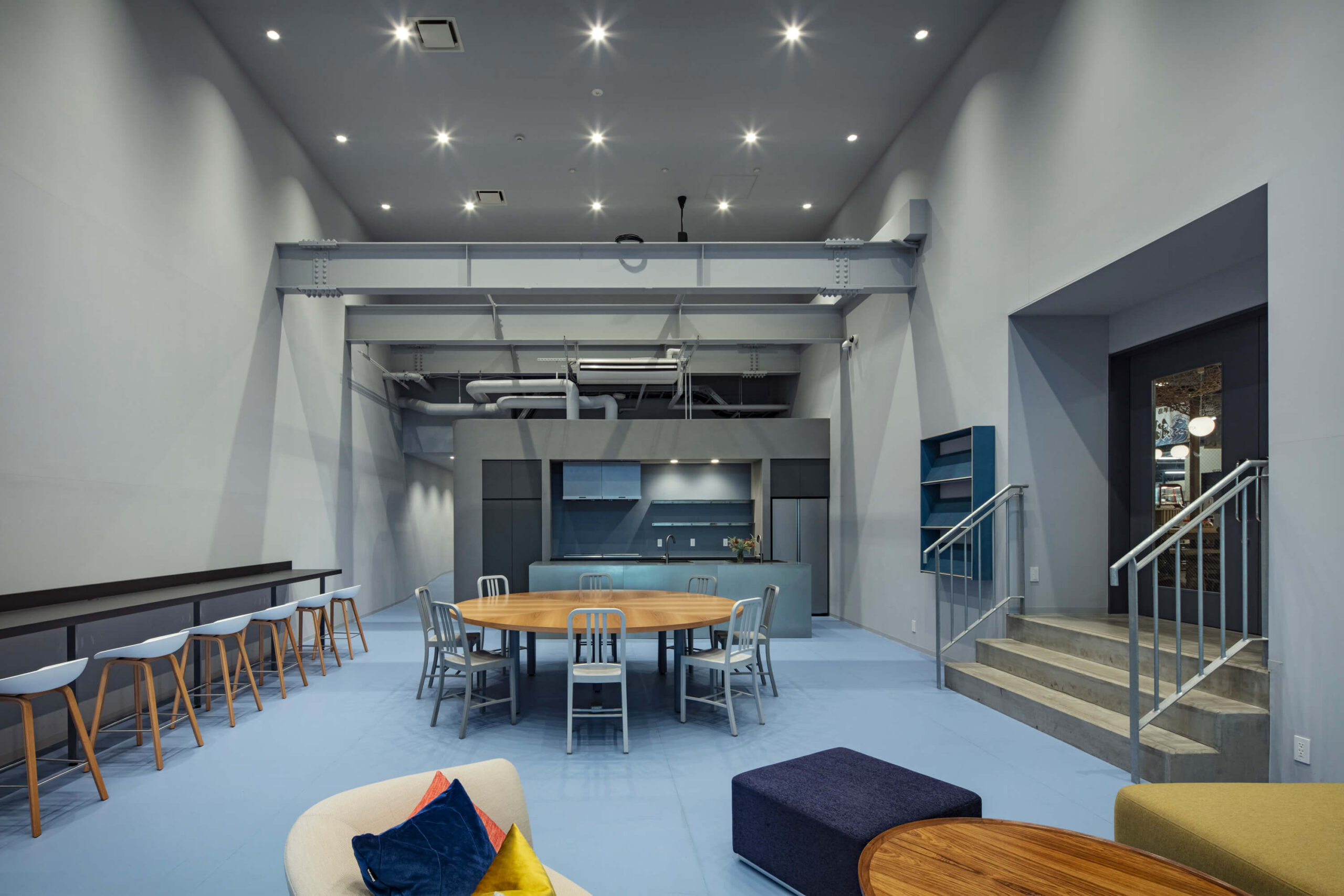 もともとは三浦半島の農水産物を販売する商業施設として2013年よりオープンした「よこすかポートマーケット」。更に面積を拡張し、物販に加えて飲食やイベントステージ、オフィス、キッチン等を加える形でリニューアルし、2022年に再オープンした。販売だけではなく「食」にまつわる体験を通して地域の魅力を発信する施設となった。2013年以前は冷凍倉庫であったために、既存の内壁を解体すると、1m近い厚みを持つ断熱層を持つキーストンプレートの壁面が現れた。断熱の機能のみならず、無骨に光る床壁の素材感をそのまま生かして内装とした。ステージを設けて立体化することで、海の向こうに猿島を望む開放的な商業施設に生まれ変わった。